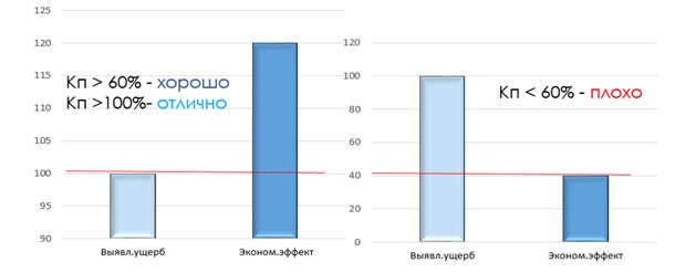 В части утрат материальных активов, сравнение выявленного и возмещенного убытков формирует коэффициент покрытия потерь. Чаще используется в рознице или логистике. Считается, что, если он превышает 0,6 (из каждых 100 потерянных рублей, возмещено 60 и более), это хорошо.
