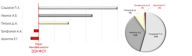 Если показатели сотрудника расположены левее Порога рентабельности, значит на сегодняшний день он получил от компании больше, чем принес ей пользы. Однако, чтобы принять решение о необходимости корректирующих мер, руководителю службы необходимо учитывать содержание и ожидаемый результат, проведенных этим специалистом мероприятий, так как эффект от его работы может быть отложенным во времени. Тем не менее уже к исходу первого полугодия, желательно, чтобы все члены команды показали, хотя бы нулевую рентабельность, а далее только положительную.