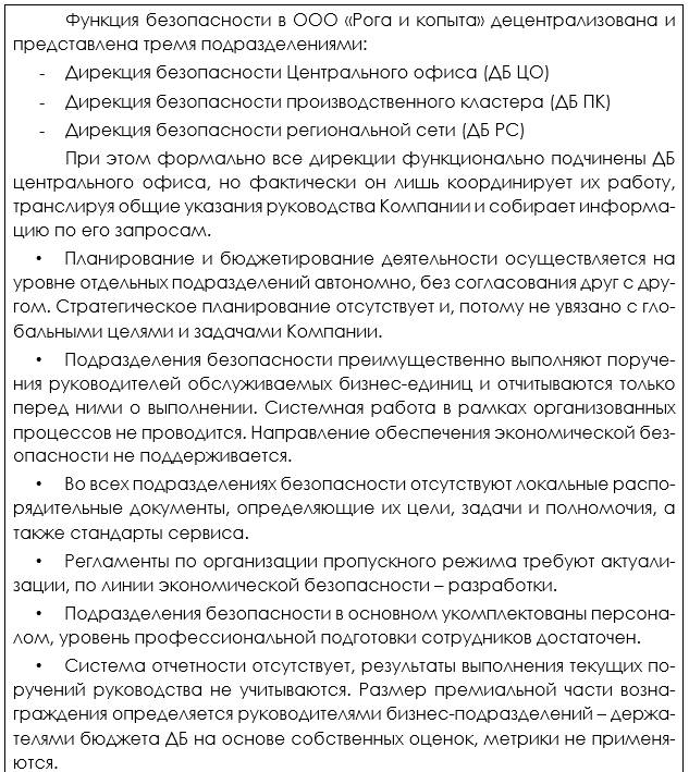 Скорее всего, Ваша Компания уже существует на рынке некоторое время, в ее структуре имеется какая-то служба безопасности, поэтому в первую очередь необходимо зафиксировать текущее положение (As Is), то есть провести мини-аудит функции.
