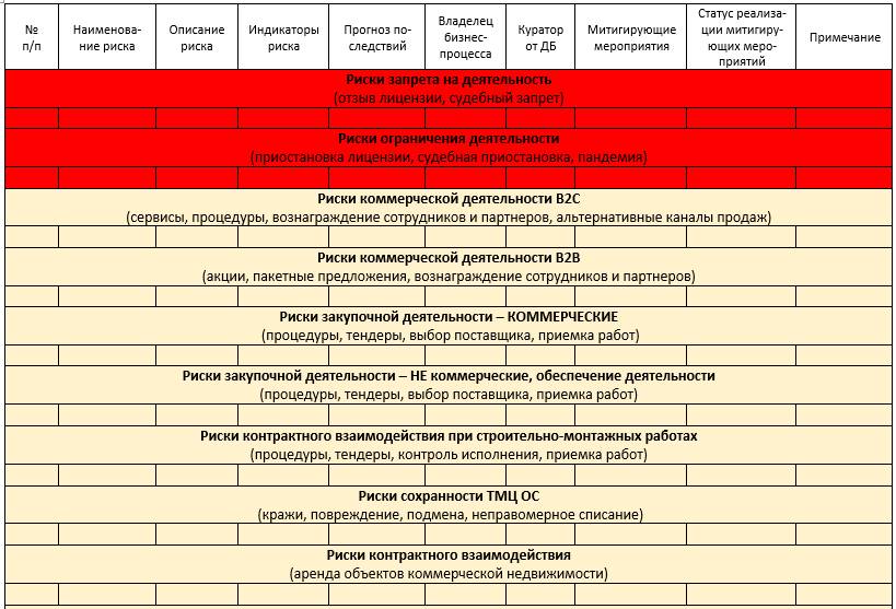 Для обеспечения контроля за текущим статусом работы по митигации рисков безопасности, ведется их Реестр с описанием угроз, разбитых по бизнес-процессам, с указанием дирекций-владельцев, ответственных сотрудников (от функции и от СБ), предложенных корректирующих мер и результата их внедрения. Для наглядности и правильной приоретизация, можно ранжировать список по степени влияния на бизнес.