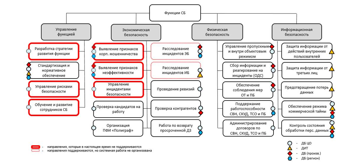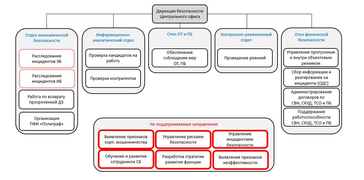 Вполне вероятно, что часть задач, которые, по нашему мнению, следовало бы решать Дирекции безопасности, в настоящее время не поддерживается вовсе, а реально проводимая работа не отражена в организационно-штатной структуре.