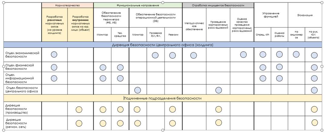 В результате проведенных манипуляций, у нас возникает понимание, каким образом изменить существующую или сформировать новую организационно-штатную структуру Дирекции безопасности, чтобы у каждой задачи (направления работы) был исполнитель.