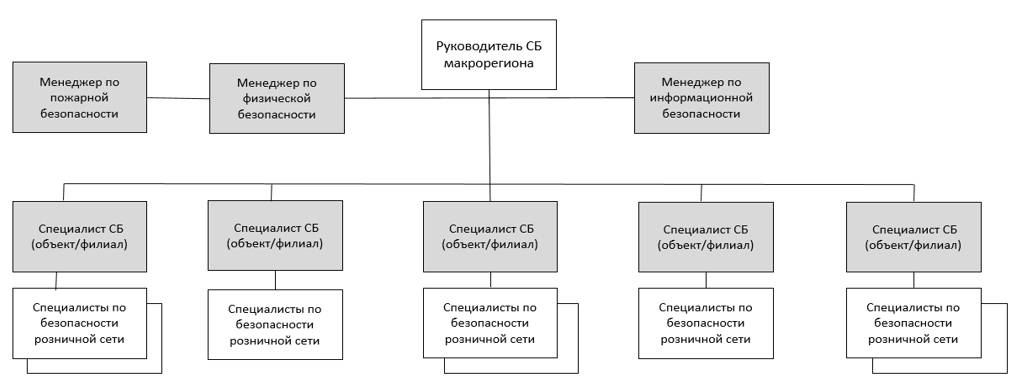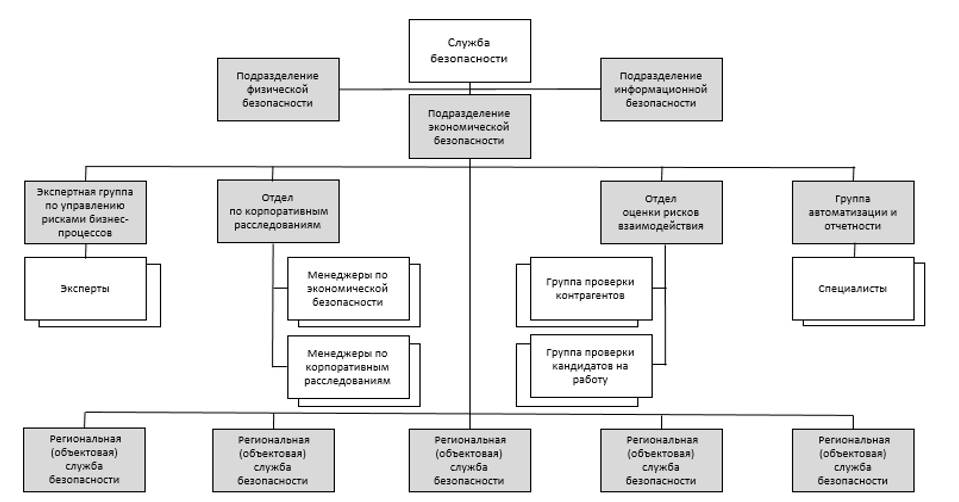 В данном варианте региональные подразделения безопасности подчинены руководителю направления ЭБ, так как основное содержание их работы – проведение расследований, а за этот процесс отвечает именно он. Но на практике чаще региональные (объектовые) подразделения замыкаются непосредственно на руководителя функции.