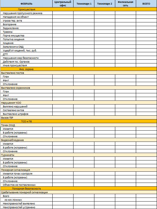 Оперативный дежурный (старший охраны) каждого объекта ежедневно заполняет свою таблицу, а значения автоматически подтягиваются ОДК и суммируются за холдинг. Подробности и описание происшествий добавляется в виде примечания.
