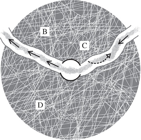 Ангел-«ветер» появляется в вашем мире точно в день вашего рождения и проходит прямо через ваш центр. Когда вы находитесь в точке A, этот ветер продвигает вас; и наоборот, если вы идете против этой «ветровой» энергии (как показывает пунктирная линия), все оборачивается против вас, как это происходит с кораблем во время сильного встречного ветра. Если же вы находитесь в точках B, C или D, ваш ангельский «ветер» вас не затрагивает, и поэтому вы просто идете, стоите на месте или отступаете, находясь под властью других течений или других ветров «моря»-мира. Из точек B, C и D вы, конечно, можете распознать струю своего «ветра» и добраться до него, но это будет нелегко; придется неизбежно идти против многих людей и против многих ситуаций, ведущих совсем в другие места, прежде чем, наконец, вы сможете попасть на путь своего «ветра».
