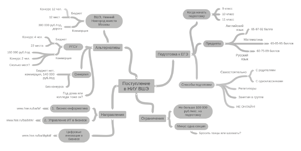 Важно! Отдельную ветвь ментальной карты стоит посвятить тому, что будет, если поступление в вуз все-таки не состоится, так как залог успеха проекта – одинаковое понимание текущей ситуации всеми его участниками. Например, на этой ветке может быть опция «пойти в вуз попроще» или «пойти на другую специальность с теми же предметами, а через год перевестись». Соответственно, и в вашем плане работ дальше появится пункт о том, что нужно эти вузы или специальности подобрать, изучить условия поступления и выполнить прочую подготовительную работу, чтобы в случае меньших баллов, чем вы ожидали, у вас был конкретный план Б. Скорее всего, выбор, сделанный заранее, будет более грамотным и взвешенным. А для ребенка это будет дополнительной мотивацией – он посмотрит, какая альтернатива его ждет в случае неуспеха, и, возможно, приложит больше усилий.