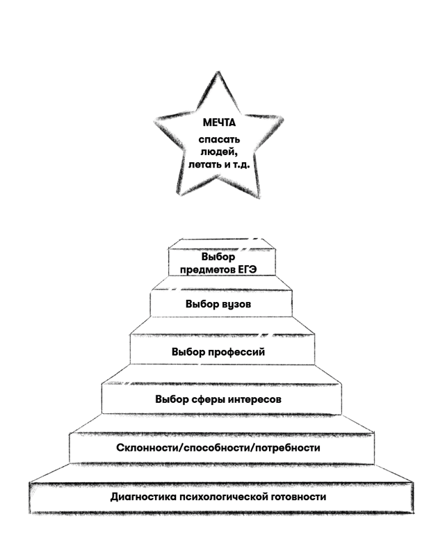 Второе. Не забывайте про силу мечты. Если в процессе профессионального самоопределения удастся найти, разглядеть, зажечь, поддержать, принять, понять и услышать мечту ребенка – это станет самым большим подарком для всех участников проекта. Сила мечты – самый действенный внутренний мотиватор, помогающий двигаться вперед на всех этапах проекта ЕГЭ. Как та самая путеводная звезда, которая будет освещать выбранный путь. О мотивации вообще и о силе мечты мы подробнее поговорим в главе 10.