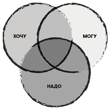 Мой учитель физики рассказывал нам о том, как он мечтал быть летчиком, хорошо учился, тренировался, у него было огромное желание летать. (Очень сильное и понятное ХОЧУ. – Прим. автора.) Но в 10 классе выяснилось, что его зрение не позволит пройти медицинскую комиссию в летное училище. (Его МОГУ никак не совпадало с областью ХОЧУ.) Зато был запрос общества (НАДО) в учителях физики (это было сразу после войны), а он также любил работать с детьми и еще в школе помогал учителям. Его интерес к физике и педагогике совпал с его возможностями по здоровью и потребностями общества, в результате в нашей школе работал прекрасный учитель, любящий свою профессию, детей, востребованный специалист и замечательный человек.