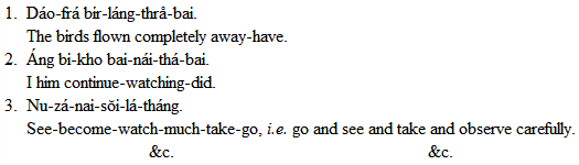 The great and characteristic feature of the Syntax of the language is the remarkable way in which verbal roots, mostly monosyllabic, are combined together to form a very large and useful class of compound verbs. In this way the use of conjunctions &c. is very largely avoided, and the language becomes possessed of a vivid force and picturesqueness often wanting in more cultivated tongues. These compound verbs may perhaps be roughly classified under two groups, e. g.—