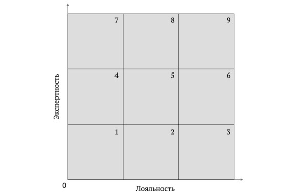 Для этих целей проанализируйте всех продавцов по двум параметрам: лояльность и экспертность. Уточним, что такое лояльность. В нашем случае – насколько человек лоялен к организации, разделяет ее ценности и интересы, любит продукт, видит свое будущее в компании, готов выполнять задачи, работать с конкретным руководителем. Под экспертностью мы подразумеваем набор умений и навыков, которые продавец использует в данное время (если умеет, но не применяет, то не учитываем). Наша задача классифицировать всех сотрудников по этим критериям.