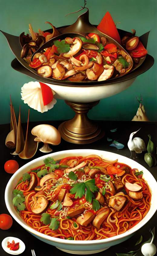 Наслаждайтесь пикантным сочетанием сочной курицы, ароматных грибов и лапши, которые прекрасно сочетаются в этом блюде.