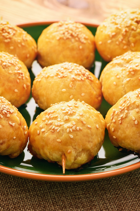 – Выложить на противень застланный пекарской бумагой. Смазать желтком, посыпать кунжутом