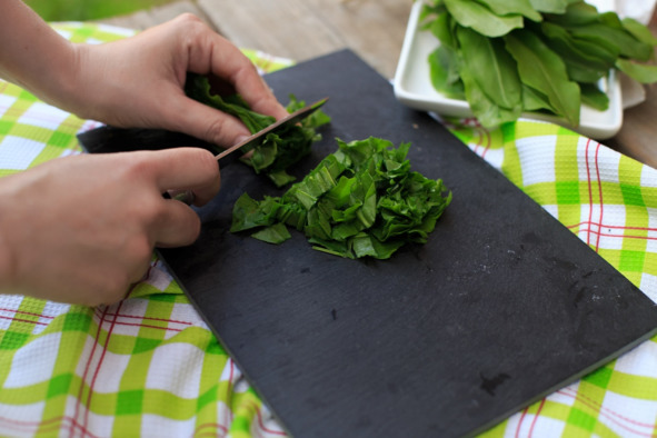 – Нарезать мелко зелень – зеленый лук и кинзу и выложить сверху хлеба