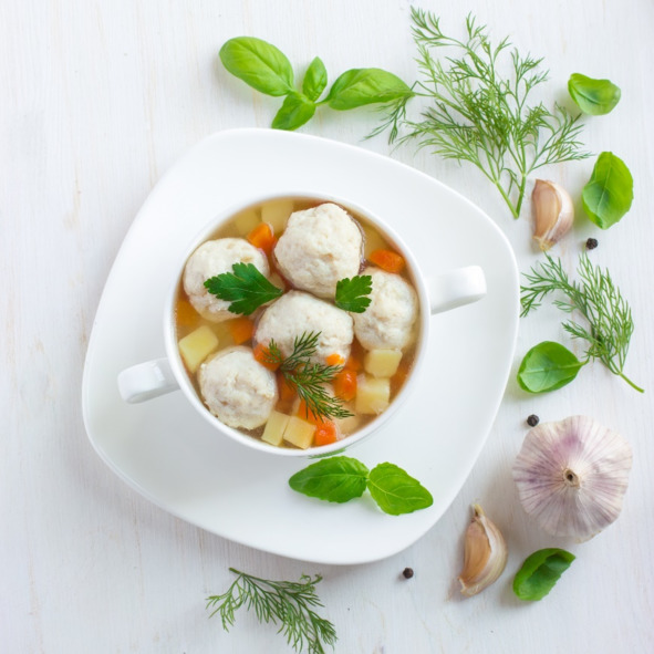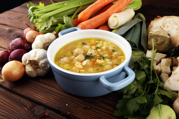 – Следом за клецками выложить поджарку и зелень в бульон, перемешать