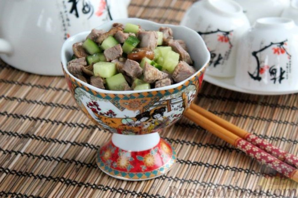 – В глубокой посуде смешать огурцы, говядину, грибы и чеснок