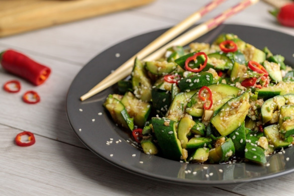 – Подготовленные продукты полить соусом, перемешать и посыпать семенами кунжута.