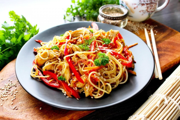– Разогреть растительное масло, обжарить в сковороде кусочки курицы
