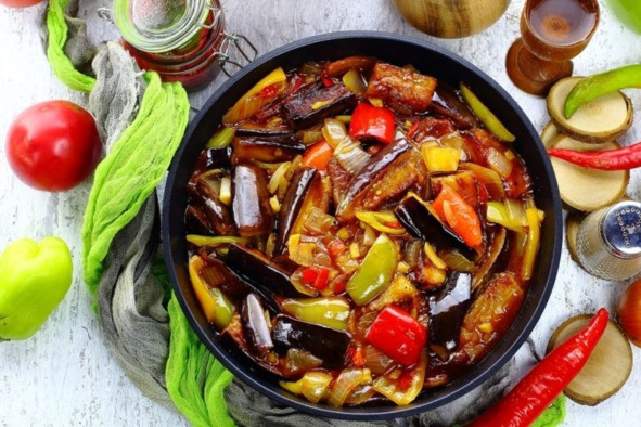 – Обжарить на растительном масле в сковороде до мягкости лук, морковь и болгарский перец, примерно 7—8 минут