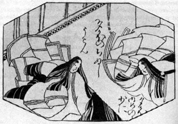 У Найси-но ками тоже оставалось теперь немало досуга, чтобы предаваться воспоминаниям, и часто, не в силах превозмочь сердечного волнения, она спешила украдкой вручить письмецо посланцу-ветру…