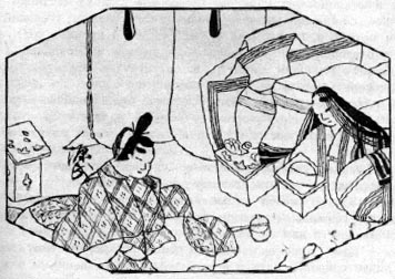 Они беседовали через занавес, но, когда Гэндзи слегка отодвинул его в сторону, женщина не стала прятаться.