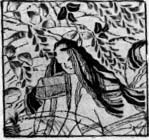 Тут проходит слух, что маленькая госпожа возвращается, и дамы принимаются хлопотать, поправляя занавес и приводя в порядок покои. Юноше очень хочется сравнить девочку с недавно увиденными цветами, поэтому он, хотя это вовсе не в его правилах, нарочно задерживается и, спрятавшись за шторой, прикрывающей боковую дверь, глядит сквозь щелку переносного занавеса.
