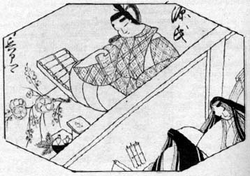Весенние цветы давно отцвели, безмятежно сияло ясное небо, а министр все размышлял над старинными песнями, снова и снова переписывая их различными скорописными почерками, в усложненном, простом или «женском» стиле, пока плод его усилий не начинал удовлетворять его. Рядом с ним не было никого, кроме двух-трех дам. Он нарочно выбрал самых достойных, надеясь, что, помогая растирать тушь, они сумеют дать ему полезный совет при выборе песен из благородных старинных собраний. Подняв занавеси, министр расположился у выхода на галерею и, разложив листы на скамеечке-подлокотнике, писал, время от времени в раздумье поднося к губам кончик кисти. Трудно себе представить более прекрасное зрелище. Настоящий ценитель получил бы истинное наслаждение, любуясь неповторимо-изящными движениями его руки, когда он снова опускал кисть, чтобы набросать несколько строк на белой или красной бумаге, прекрасно оттеняющей сочность туши.