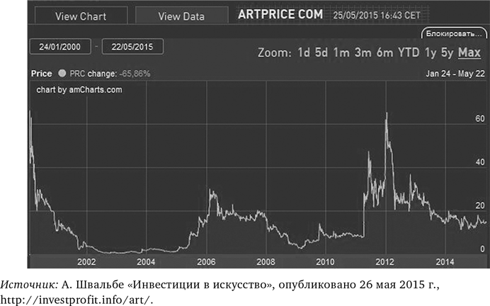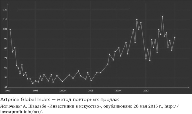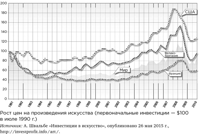 Может быть, спасение в искусстве? Такое мнение поддерживается историями о картине, купленной, например, за 2 млн долларов и перепроданной за 20 млн. Такие истории нравятся журналистам и владельцам картин. Однако это единичные случаи, возводимые в теорию. Что-то дорожает, что-то дешевеет, но такие истории менее увлекательны. Для достоверности нужно что-то вроде индекса, сделанного по примеру фондовых рынков, – обобщение тысяч актов купли-продажи.