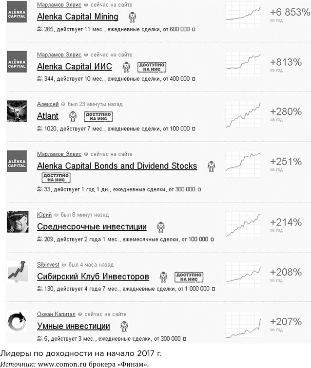 Вот данные на начало 2017 года с популярного сервиса Comon, созданного крупным брокером «Финам» для наблюдения за чемпионами и копирования их чемпионских сделок.