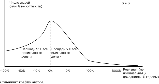 То, что простирается вправо и влево, называется хвостами распределения. В правом хвосте у нас победители, имеющие положительную доходность, в левом – неудачники с отрицательной. Длина хвоста – это цифра предельно возможной доходности. Правый хвост длиннее, потому что проиграть можно только 100 %, а выиграть можно и 200 %, и 2000 %. Зато правый хвост тоньше. Площадь S, расположенная вправо от медианы, должна соответствовать площади S´, расположенной влево. Хотя бы только отсюда виден важнейший принцип.