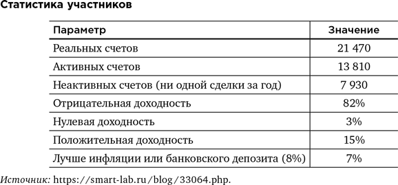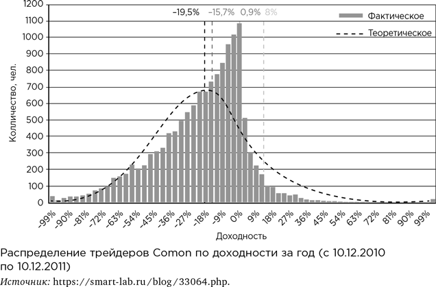 Если кого-то не убеждает дедуктивная логика, можете пойти индуктивным путем – придете туда же. Берите статистику и смотрите. Пример с форума Smart-lab по статистике с ресурса Comon. Того самого, где мы уже видели чемпионов. Данные, правда, за 2011 год, но если вы понимаете, как устроена игра, вы понимаете, что ее правила и итоги особо не меняются.