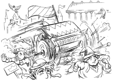 Перед ратушей красовалась странная деревянная конструкция, огороженная невысоким забором. Рядом толпились местные жители с плакатами и табличками. Вилли и Добрый Жук решили подойти поближе и узнать, что происходит.