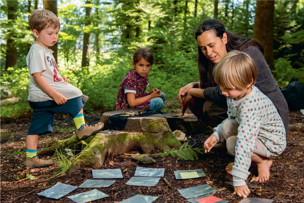 Mittelteil > Bei jüngeren Kindern besteht dieser Teil aus Freispiel. Bei den älteren Kindern ist es wichtig, dass dieser Teil gut rhythmisiert ist: Wechseln Sie zwischen ruhigen und dynamischen Aktivitäten ab, nutzen Sie verschiedene Zugänge zur Natur, ändern Sie die Sozialformen. In dieser Sequenz sollten die Kinder aktiv tätig sein und die Umgebung unmittelbar erfahren können. Je nach Klasse braucht es zum Einstieg eine Aktivität, welche die Aufmerksamkeit der Kinder fokussiert: ein Tasträtsel machen, Natur durch das Handmikroskop oder mit dem Spiegel beobachten, möglichst viele Geräusche sammeln, häufige Tierspuren gemeinsam anschauen und beschreiben, bevor die Kinder sie selber suchen gehen …