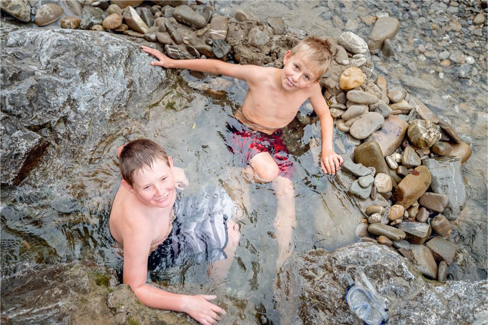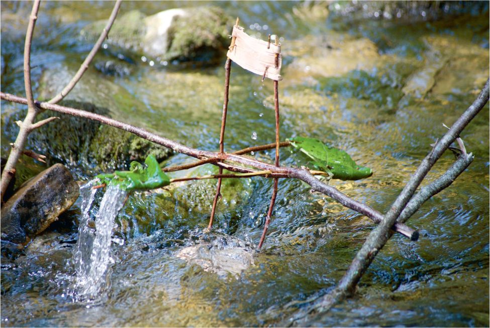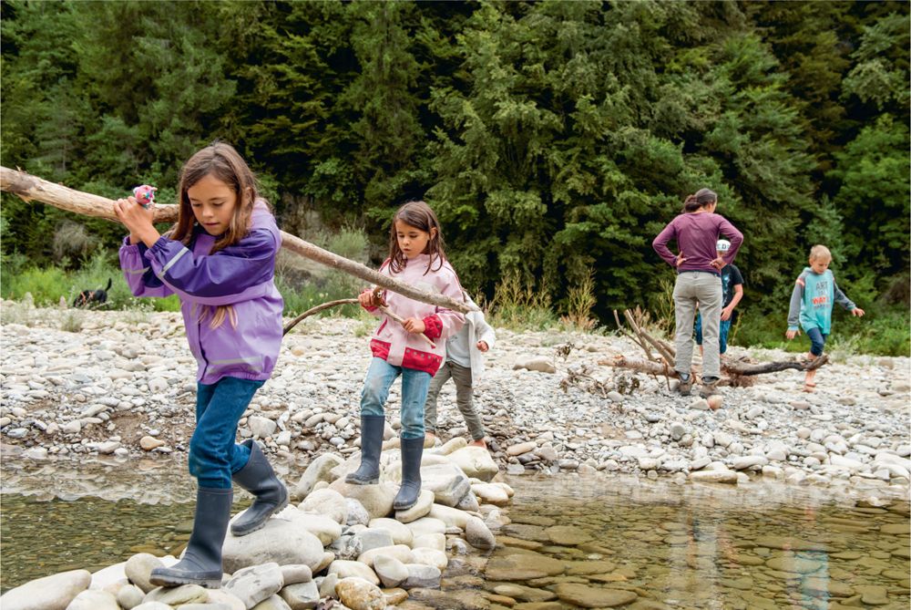 Bewegung und Sport > Dem Bachlauf in der Gemeinde (oder von unserem Standort bis zur Quelle) folgen, einen Orientierungslauf entlang des Baches machen, von Stein zu Stein hüpfen, Wasser in Schneckenhäusern transportieren, den Bachverlauf als Tanz darstellen.