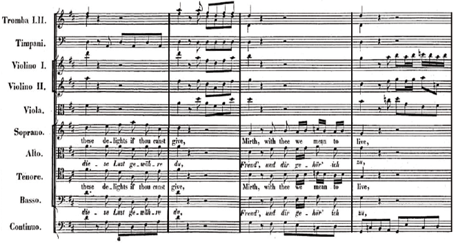 a) Cadencia a la Tónica. Puedo preparar, como articulación conclusiva, este hito de puntuación, con una sutil detención, ya sea en la disonancia (que así es suntuosamente disfrutada) o en la cesura que precede los trinos implícitos en la parte de Sopranos y Altos.