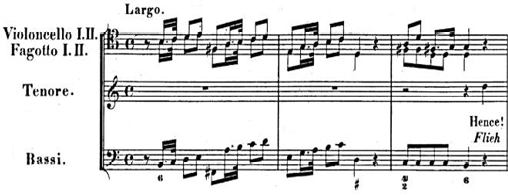 Aquí uno puede apoyarse en el esqueleto melódico (Uhr Melodie) en los compases iniciales, para realizar los segundos y terceros tiempos como si se tratara de adornos “alla italiana” de dicha Uhr Melodie, es decir con aire audazmente improvisatorio. Asimismo, una licencia agógica de cierta elegancia consiste en detenerse en la primera corchea del penúltimo compás, considerando la escala sucesiva como un mero agregado de energía “sobrante” o puente hacia el violín solista. El ejemplo 47 sugiere una mirada análoga, rapsódicamente flexible, aprovechando el apacible estatismo del bc.