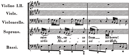 b) Unísono. Cuando la trama presenta un categórico unísono, como en el siguiente ejemplo, se intuye un andar rubato, probablemente en accelerando, con un sutil rallentando en el compás 3, cuando las voces finalmente se dividen.