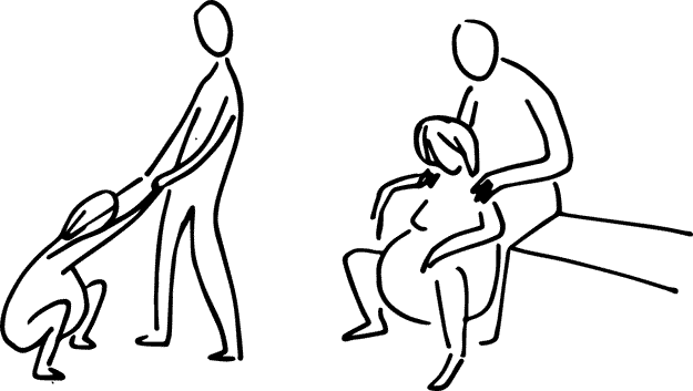 Предостережение: Если у нее есть проблемы с голеностопными, коленными или тазобедренными суставами, если у нее начинают болеть какие-либо из этих суставов или лонное сочленение (посередине внизу живота), тогда ей не следует выполнять это упражнение. На иллюстрациях изображено, как партнер может поддерживать женщину, когда она сидит на корточках.