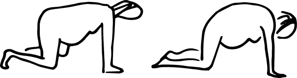 Стоя на четвереньках нужно подогнуть под себя таз, округляя спину, и медленно сосчитать до пяти, затем ненадолго вернуться в исходное положение (с прямой спиной). При выгибании должно ощущаться сильное напряжение мышц живота. Задерживать дыхание не нужно. Повторяйте в общей сложности десять раз в день. См. иллюстрации.