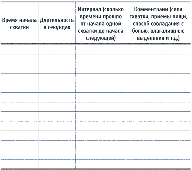 На ранней стадии родов одна из важнейших задач партнера в родах – считать схватки. Поскольку изменения в длительности, силе и частоте схваток являются крайне важными признаками настоящих, прогрессирующих родов, вам желательно, во-первых, знать, как их правильно считать, и, во-вторых, вести их запись. Тогда при звонке врачу будущей мамы вы сможете предоставить ему точную и конкретную информацию.