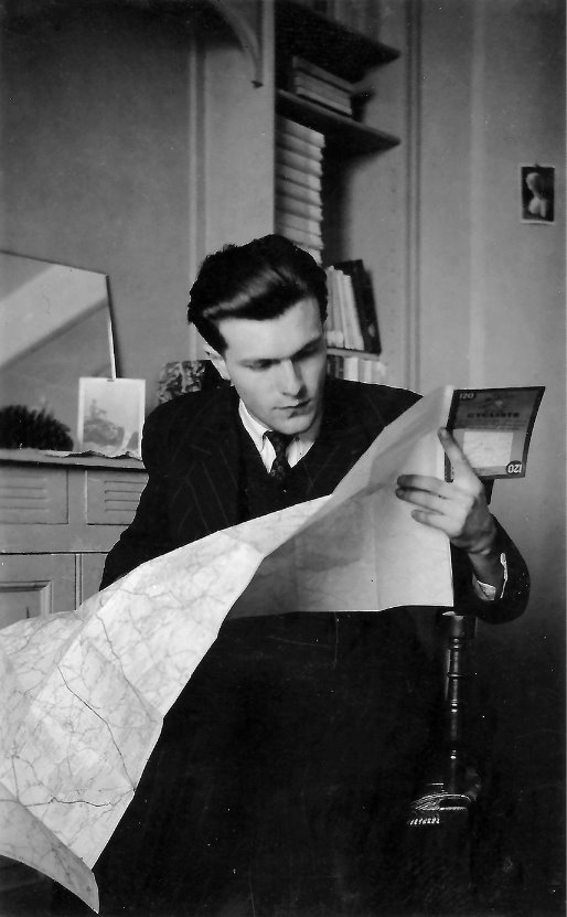 Симондон рассматривает карту велосипедных дорог окрестностей Парижа (Michelin, 1944). Высшая нормальная школа, Париж. 1948. Фото Мишель Симондон