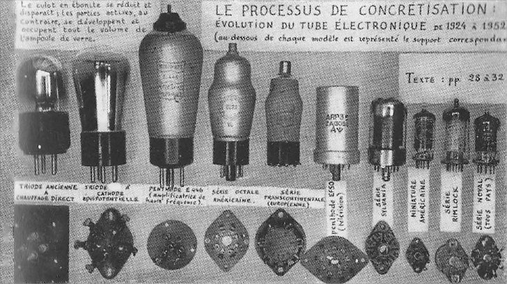 Иллюстрация к работе «О способе существования технических объектов». Справа вверху заголовок: «Процесс конкретизации: эволюция электронной лампы с 1924 по 1952 г. (под каждой моделью представлена соответствующая ламповая панель)»