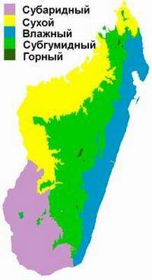 По температуре и осадкам можно выделить пять основных климатических регионов (рис. 4). Тропический климат господствует на восточном побережье со средней температурой воздуха 2427 °C, продолжительность влажного сезона здесь составляет около 11 месяцев. В центральных нагорьях климат горный тропический с количеством осадков от 1300 до 2000 мм в год. Хорошо выражен влажный сезон с ноября по апрель, когда выпадает практически всё среднегодовое количество осадков. Сухой сезон – с мая по сентябрь, с температурами 16–17 °C. Снег выпадает на высотах более 2400 м над у.м., за исключением массива Анкаратра. Снежный покров может сохраняться несколько дней. Северо-Западная часть Мадагаскара имеет более сухой морской климат на побережье и континентальный – в глубине острова со средним годовым количеством осадков около 1600 мм, выпадающих с ноября по март. На юго-западе и юге климат полупустынный, осадков выпадает менее 400–800 мм в год.