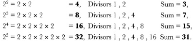 Pythagoras was entertained by perfect numbers but he was not satisfied with merely collecting these special numbers; instead he desired to discover their deeper significance. One of his insights was that perfection was closely linked to ‘twoness’. The numbers 4 (2 × 2), 8 (2 × 2 × 2), 16 (2 × 2 × 2 × 2), etc., are known as powers of 2, and can be written as 2n, where the n represents the number of 2’s multiplied together. All these powers of 2 only just fail to be perfect, because the sum of their divisors always adds up to one less than the number itself. This makes them only slightly defective: