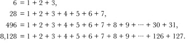 The most significant and rarest numbers are those whose divisors add up exactly to the number itself and these are the perfect numbers. The number 6 has the divisors 1, 2 and 3, and consequently it is a perfect number because 1 + 2 + 3 = 6. The next perfect number is 28, because 1 + 2 + 4 + 7 + 14 = 28.