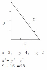 You can now measure the longest side z, the so-called hypotenuse, and square this length. The remarkable result is that this number z2 is identical to the one you just calculated, i.e. 52 = 25. That is to say,