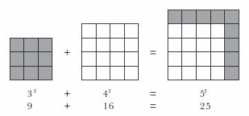 Figure 3. Finding whole number solutions to Pythagoras’ equation can be thought of in terms of finding two squares which can be added together to form a third square. For example, a square made of 9 tiles can be added to a square of 16 tiles, and rearranged to form a third square made of 25 tiles.