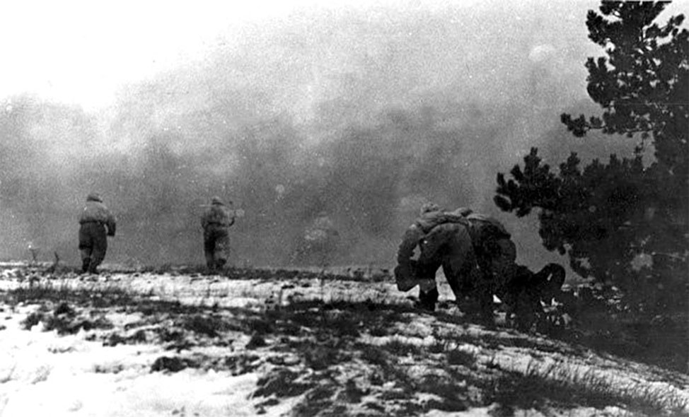 Воины 120-й гвардейской стрелковой дивизии 3-й армии наступают под прикрытием дымовой завесы. Источник: БГМИВОВ