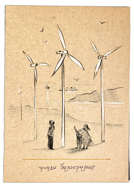 Отряд гигантов на горе, нависший над городом. Трижды белокрылые, они синхронно и размеренно вращают маховик, но остаются неподвижными и грозными. Раньше это было бы про величие и смирение, раньше тут были бы пилигримы. Паломник был бы потрясен увиденной свыше картиной-ощущением. Но сейчас – это прагматичное использование природы человеком. Украденное у «всего-лишь» стихии…