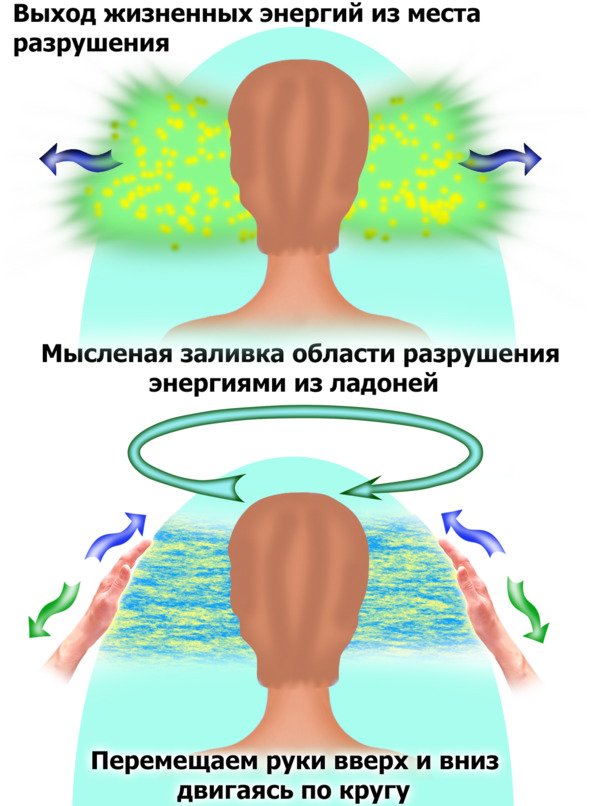 Как только мы сказали вышеприведённую фразу, из наших рук пойдут энергии, которые, по мнению Высших сил, наилучшим образом подходят для данной работы именно с этим человеком. Далее мы прикладываем свои ладони с обоих сторон головы к мысленной границе тонких тел чуть выше придуманного вами разрушения и начинаем сканировать место разрушения вверх и вниз, постепенно передвигаясь вокруг образа человека. Фактически нам необходимо заполнить энергиями разрушение со всех сторон тонких тел, для чего, собственно, мы и постепенно движемся вокруг человека. Мы уже говорили, что в данном случае мы работаем с наихудшим видом разрушений. Если же вы чувствуете поля тонких тел и его разрушения, то можете самостоятельно понять, где стоит работать, и тем самым сэкономить своё золотое время. Однако, если вы не чувствуете разрушений, ваша работа с тонкими телами там, где они не разрушены, всё равно принесёт пользу. Вред в любом случае невозможен, так как вы используете жизненные энергии Творца.