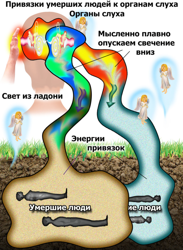 Первый этап – отпускание. После произнесения обращения к умершим представляем, как души умерших уходят вверх. Для нас этот процесс наблюдения за уходящими душами займёт около одной минуты, после чего начинаем второй этап работы – осветление привязок. Дело в том, что энергии умерших, чаще всего, уходят самостоятельно крайне медленно, поэтому для этого требуется ваша работа. Таким образом, после отпускания душ умерших, представляем на внутренних органах слуха энергию привязки любой формы. Лучше представить привязку, охватывающую обе части внутренних органов слухового аппарата, и мысленно направить в неё яркий свет из приложенной к уху ладони. Мысленный свет по привязке необходимо распространять до полного заполнения представленного эгрегора отпускаемых людей, и поддерживать свечение всего объёма привязки около двух минут.